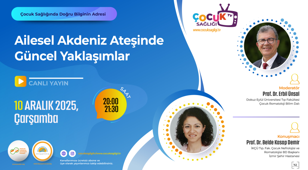 Çocuk Sağlığı TV, 10 Aralık 2025 Çarşamba günü saat 20.00-21.30 arasında canlı yayınla "Ailesel Akdeniz Ateşi'nde Güncel Yaklaşımlar" konulu önemli bir programa ev sahipliği yapacak. Moderatörlüğünü Dokuz Eylül Üniversitesi Çocuk Romatoloji Bilim Dalı'ndan Prof. Dr. Erbil Ünsal'ın üstlendiği yayında, İKÇÜ Tıp Fakültesi Çocuk Nefrolojisi ve Romatolojisi BD Başkanı Prof. Dr. Belde Kasap Demir konuşmacı olarak yer alacak. Etkinlik, çocuk sağlığında doğru bilginin adresi olmayı hedefleyen platformun ücretsiz abonelikle takip edilebilen yayınları arasında dikkat çekiyor.